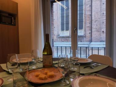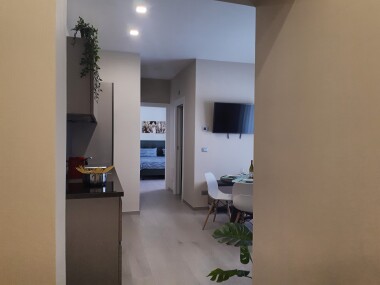 The Smart Apartment Mercanzia is a modern one-bedroom apartment located in the prestigious Galleria dei Notai, in the heart of Bologna. Ideal for tourist stays, this flat combines comfort, style and an unbeatable location, just a few steps from Piazza Maggiore and the city's main attractions. Upon entering, the flat welcomes guests with a bright and well-furnished living room. Here, a comfortable sofa, which can be converted into a bed to accommodate an additional two people, creates a relaxing corner perfect for unwinding after a day of exploration. The living area is completed by a flat-screen TV and a dining table, ideal for enjoying meals in an intimate and peaceful setting.