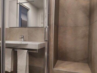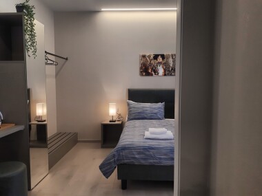 The modern, fully-equipped open kitchen is equipped with all the necessary appliances, including a hob, oven, refrigerator and crockery, allowing guests to cook in the comfort of their own home. Its layout optimises space, offering practicality without sacrificing style. The master bedroom is a haven of tranquillity, with a large bed and functional furnishings including a large wardrobe for storing clothes and personal items. High-quality finishes and thoughtful details create a relaxing atmosphere, perfect for ensuring a rejuvenating sleep. The stylish and modern bathroom is equipped with a spacious shower and high-quality sanitary ware. Bright surfaces and a courtesy set ensure a comfortable and pleasant experience. The location of the Smart Apartment Mercanzia is one of its strengths: situated in the historic Galleria dei Notai, it offers immediate access to Bologna's sights, such as the Two Towers, the Basilica of San Petronio and the city's characteristic arcades. Its proximity to restaurants, cafés and shops allows for an authentic Bolognese experience.